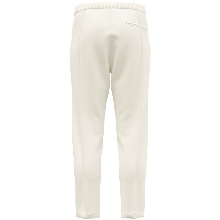 A keskenyedő nadrágszár és a varrt hajtás elegáns sziluettet kölcsönöz a nadrágnak, retro hangulattal. A két részből álló rugalmas derékrész húzózsinórral tökéletes illeszkedést biztosít, miközben gombbal, cipzárral biztonságosan zárható.